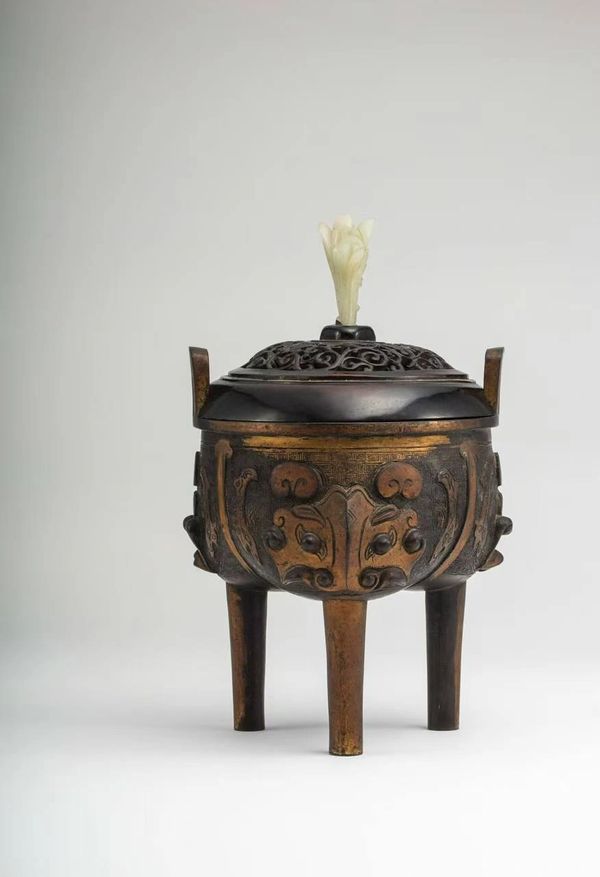 香炉の蓋は紫檀(したん)で作られており、その温かみのある光沢は鍍金青銅の黄金色の輝きと美しく調和し、上品な視覚的対比を生み出しています。蓋の頂には和田玉(ホータンぎょく)のつまみが嵌め込まれており、精緻な彫刻と滑らかな研磨によって、作品全体に一層の貴重さと芸術的洗練を添えています