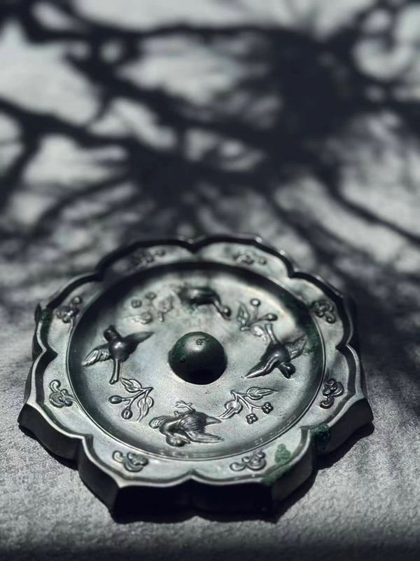この青銅鏡は唐代(618~907年)にさかのぼるもので、唐代を代表する装飾鏡の形式の一つ――葵花形鏡(きかけいきょう)です。縁は花びらのように波打ち、造形と寓意の両面において優雅さを追求した唐代工芸の美意識を体現しています。